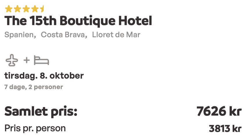 Hvis rejsen er med “Vis fly” og “Vis hotel” link, så er der tale om en sammensat rejse. Det vil sige at fly og hotel skal bestilles hver for sig. Prisen vi angiver vil dog være samlet for fly og hotel med mindre andet er angivet.