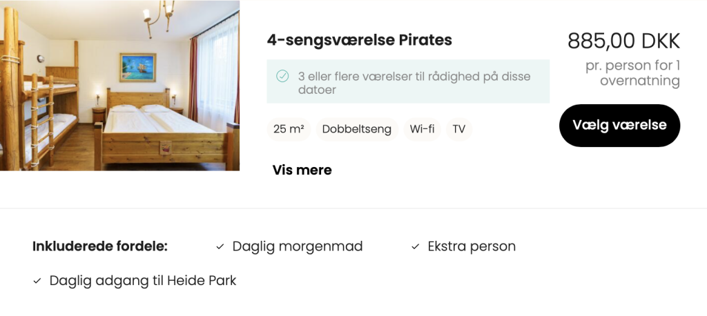 Vi har taget udgangspunkt i et ophold i Holiday Camp Soltau – i en træhytte til 4 personer. Ved et ophold i Holiday Camp er der både inkluderet adgang til Heide Park på ankomstagen samt på afrejsedagen. Derudover er opholdet med halvpension, hvor der indgår ikke alkoholiske drikke til måltiderne samt en snack kupon til brug i parken. Slutrengøringen er ligeledes inkluderet i prisen.
