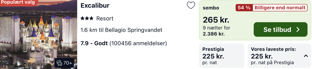 Vi har taget udgangspunkt i det 3-stjernede Excalibur Hotel, der modtager gode anmeldelser af de tidligere gæster. Hotellet byder bl.a. på pæne værelser og et casino. Vælg Super.com for at opnå den billigste pris.