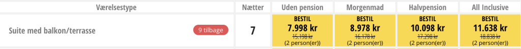 Dit ophold er uden pension, men det er muligt at tilkøbe både morgenmad, halvpension (morgenmad og aftensmad ekskl. drikkevarer til aftensmad) og All Inclusive.