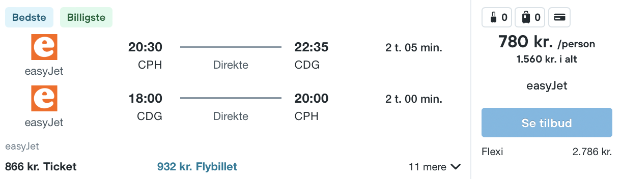 Tjek altid datoerne for at se om de passer sammen før du bestiller, da vi kan have begået fejl. Tjek derudover også prisen på begge ting før du bestiller det ene, da prisen kan have ændret sig. Der kan også være små variationer i prisen mellem mobil og pc.