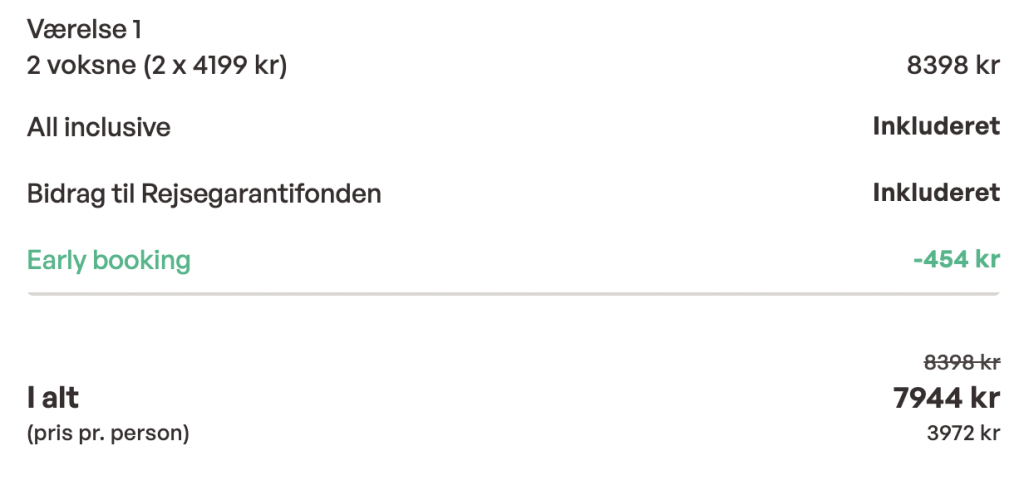 Prisen tager udgangspunkt i 2 personer. Man kan sagtens rejse flere voksne og eller med børn og derved typisk opnå en billigere pris pr. person.
