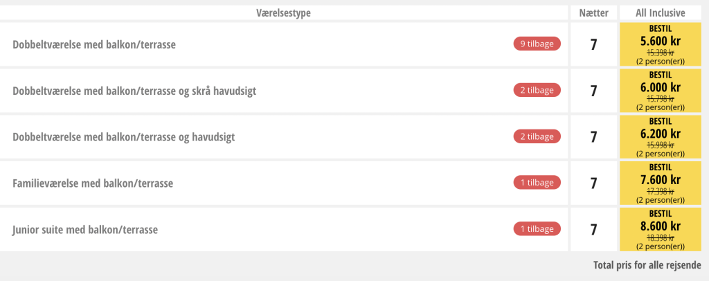 Prisen tager udgangspunkt i 2 personer. Man kan oftest rejse flere voksne og eller med børn og derved typisk opnå en billigere pris pr. person.