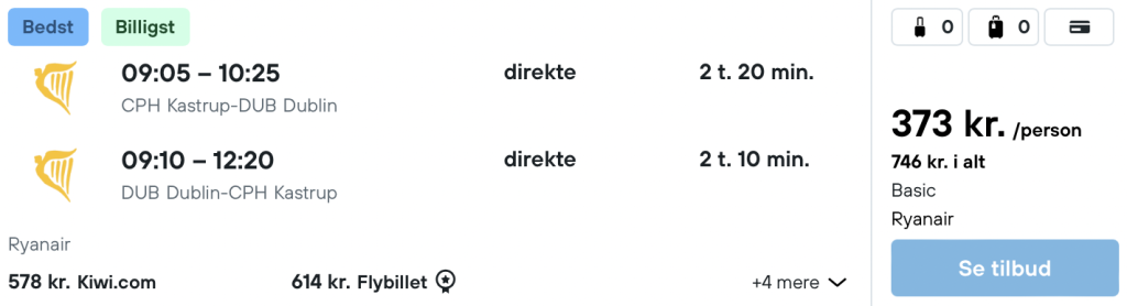 Flyprisen inkluderer en lille taske, men håndbagage eller bagage kan tilkøbes.