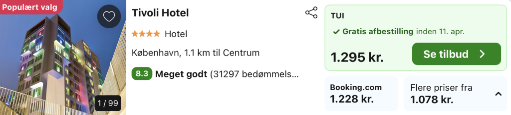Vi har taget udgangspunkt i et ophold fra den 11. – 12. april, men der er andre datoer til gode priser på Tivoli Hotel. Se et udvalg her: