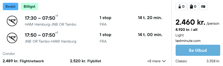 På vores flysøgningsmaskine har vi fundet billige flybilletter fra Hamborg og København til Johannesburg i Sydafrika: