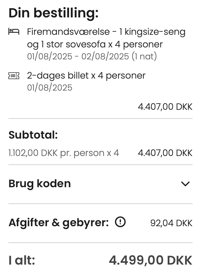 Bemærk: Den samlede pris for opholdet er 4.499,- for 4 personer, hvilket svarer til 1.125,- per person. Rejs365 er ikke et rejsebureau, men en rejseside, der finder gode tilbud! – Vi modtager kommission, men det påvirker ikke din pris! Læs mere her |
