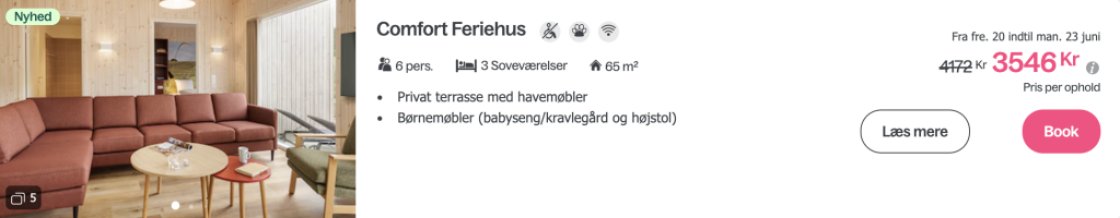 | Den samlede pris for opholdet er 3.546,- for 6 personer i en feriebolig, hvilket svarer til 591,- per person. |