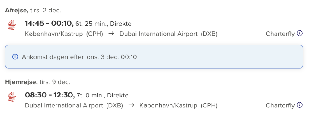 Hvis rejsen er med “Vis fly” og “Vis hotel” link, så er der tale om en sammensat rejse. Det vil sige at fly og hotel skal bestilles hver for sig. Prisen vi angiver vil dog være samlet for fly og hotel med mindre andet er angivet.