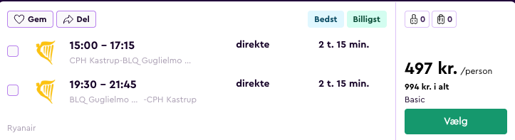 På vores flysøgemaskine har vi fundet billige flybilletter fra København til Bologna: