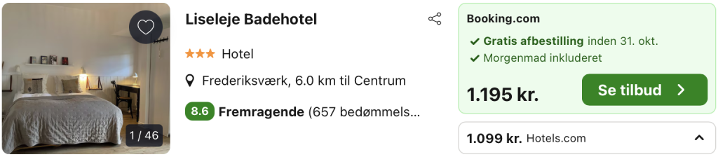 Der er flere datoer tilgængelige til samme billige priser. Vælg f.eks mellem de af os foreslåede alternativer herunder. Ønsker du at søge på andre datoer eller fler overnatninger, så kan du også gøre det i kalenderen.