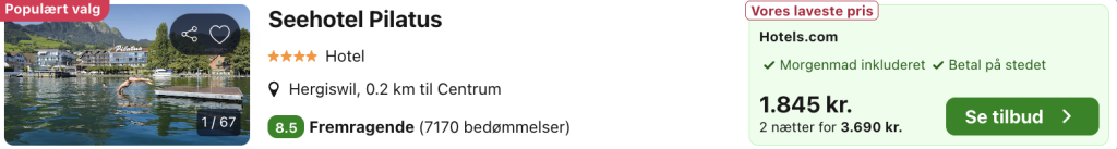 Vi har taget udgangspunkt i det 4-stjernede Seehotel Pilatus, der ligger ved bredden af Luzern-søen. Hotellet byder på stor indendørs pool, spabad og gratis wi-fi. De rummelige værelser har aircondition samt udsigt over bjergene og store vinduer samt fladskærms-tv og radio. Nogle af værelserne har møblerede balkoner med udsigt over søen. Wilhelm Tell Restaurant byder på internationale retter og spisning ud til søen. Pilatus har en natklub med levende musik, og et fitnesscenter med udstyr til konditionstræning.