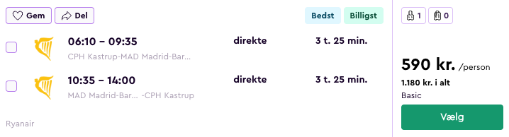 Hvis rejsen er med “Vis rejse” link, så er der tale om en pakkerejse, hvor fly og hotel bestilles på en gang.