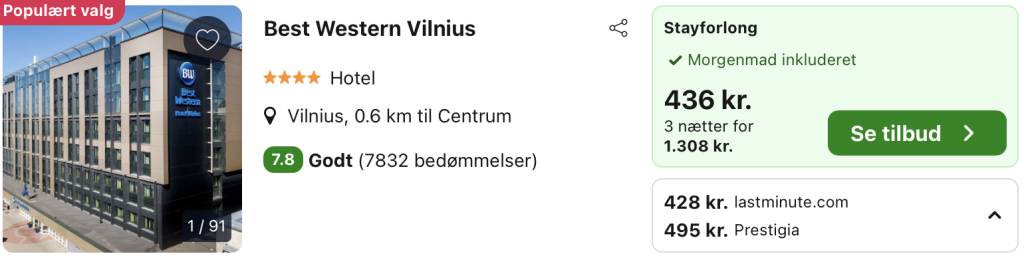 Vi har taget udgangspunkt i det 4-stjernede Best Western Vilnius, der modtager gode anmeldelser af de tidligere gæster og bl.a. byder på inkluderet morgenmad, indvendig pool og central beliggenhed i Vilnius!
