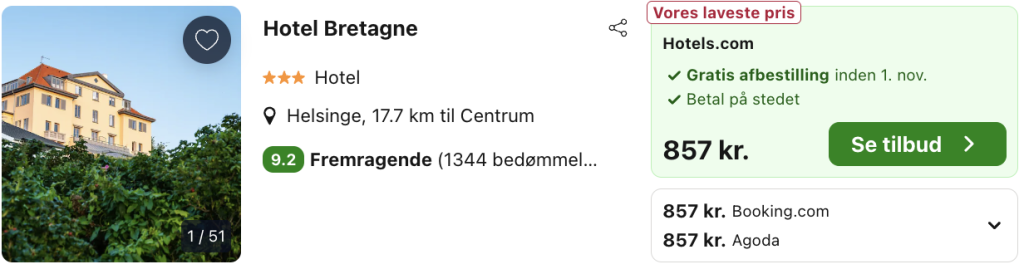 Vi har taget udgangspunkt i et ophold fra den 2. – 3. november. Der er andre datoer til gode priser på Hotel Bretagne.