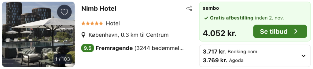 Vi har taget udgangspunkt i et ophold fra den 6. – 7. november, men der er andre datoer til gode priser på Nimb Hotel.