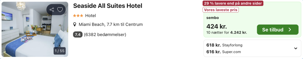 F.eks. 11 dage på Miami Beach for kun 4.856,- per person inkl. fly og 3-stjernet hotel med pool og god beliggenhed!