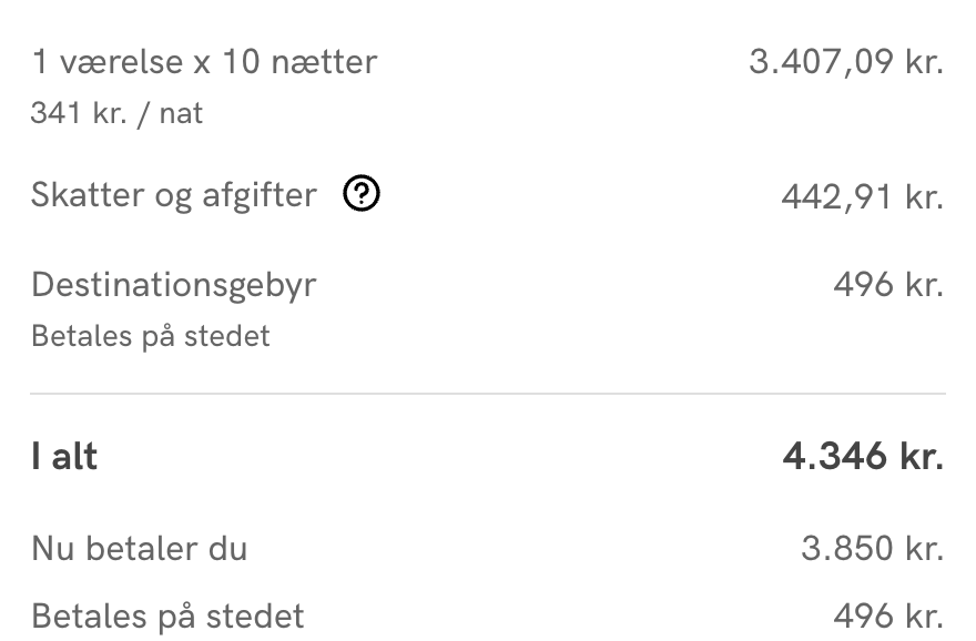 Bemærk: Den samlede pris for hotellet er 4.346,- for 2 personer i et dobbeltværelse, hvilket svarer til 2.173,- per person. |