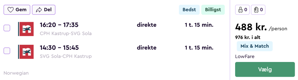 Hvis rejsen er med “Vis rejse” link, så er der tale om en pakkerejse, hvor fly og hotel bestilles på en gang.