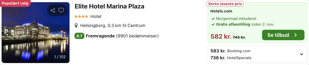 Vi har taget udgangspunkt i et ophold fra 2. – 3. november. Der er andre datoer til gode priser på Elite Hotel Marina Plaza. Se et udvalg her: