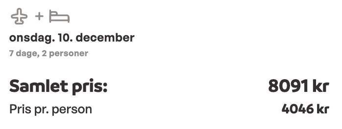 Hvis rejsen er med “Vis fly” og “Vis hotel” link, så er der tale om en sammensat rejse. Det vil sige at fly og hotel skal bestilles hver for sig. Prisen vi angiver vil dog være samlet for fly og hotel med mindre andet er angivet.