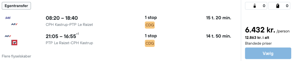 Hvis rejsen er med “Vis fly” og “Vis hotel” link, så er der tale om en sammensat rejse. Det vil sige at fly og hotel skal bestilles hver for sig. Prisen vi angiver vil dog være samlet for fly og hotel med mindre andet er angivet.