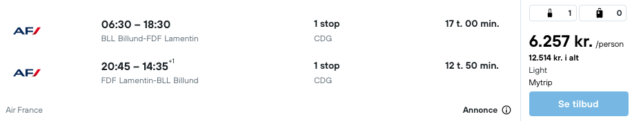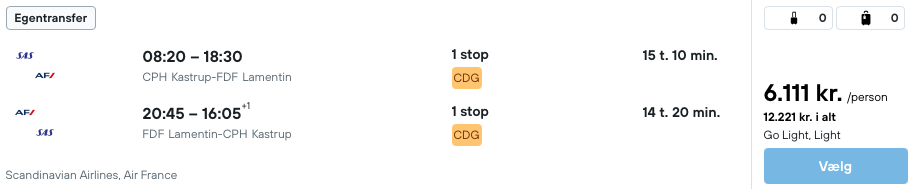 Vær opmærksom på, at flyet vi har taget udgangspunkt i er med egentransfer. Husk at tage højde for at der skal være tid til at hente bagage og checke ind påny i Paris.