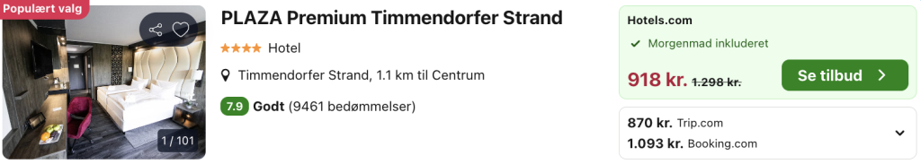 Vi har taget udgangspunkt i et ophold fra den 2. – 3. november på PLAZA Premium Timmendorfer Strand, der har flotte og nyrenoverede værelser. Trænger du til afslapning kan du koble af i hotellets store wellnessområde med både spa og pool. Hotellet har flere forskellige værelsestyper. Vi har taget udgangspunkt i et Premium Comfort Plus værelse med havudsigt.