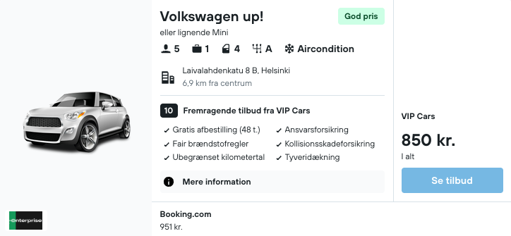 Bemærk: Den samlede pris for hotellet er 3.552,- for 2 personer i et dobbeltværelse hvilket svarer til 1.776,- per person. Den samlede pris for leje af bil er 850,- hvilket svarer til 425,- per person ved 2 personer. |