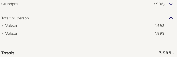 Prisen tager udgangspunkt i 2 personer. Man kan sagtens rejse flere voksne og eller med børn og derved typisk opnå en billigere pris pr. person.