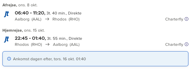 Hvis rejsen er med “Vis fly” og “Vis hotel” link, så er der tale om en sammensat rejse. Det vil sige at fly og hotel skal bestilles hver for sig. Prisen vi angiver vil dog være samlet for fly og hotel med mindre andet er angivet.