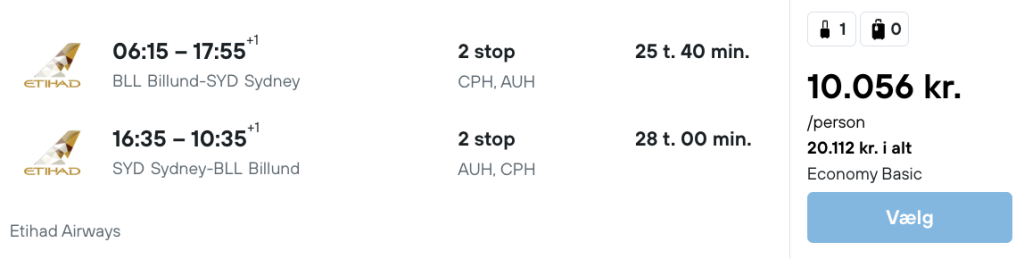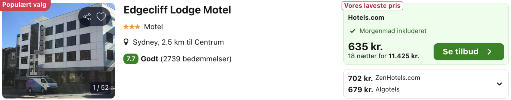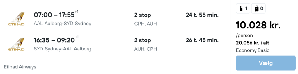 Bemærk: Der kan være mindre forskelle i prisen på mobil og pc. Undersøg med fordel, hvor det er billigst inden bestilling. Vær opmærksom på at udrejse er den 20. november, mens ankomst i Sydney er den 21. november. Dette er der taget højde for i hotel overnatning. Rejs365 er ikke et rejsebureau, men en rejseside, der finder gode tilbud! – Vi modtager kommission, men det påvirker ikke din pris! Læs mere her |