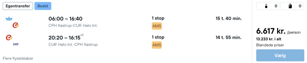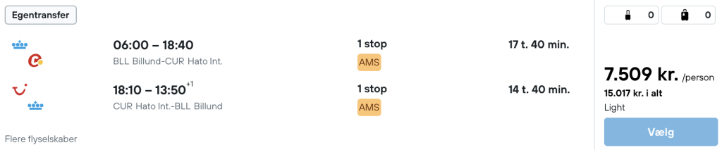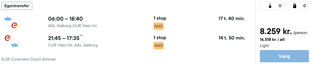 Vær opmærksom på, at flyet vi har taget udgangspunkt i er med egentransfer. Husk at tage højde for at der skal være tid til at hente bagage og checke ind påny i Amsterdam.