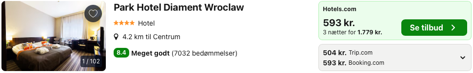 Vi har taget udgangspunkt i det 4-stjernede Park Hotel Diament Wroclaw. Hotellet modtager meget gode anmeldelser af de tidligere gæster og byder bl.a. på flotte værelser med eget badeværelse.