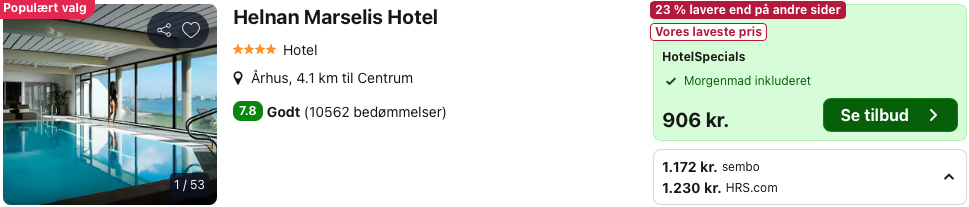 Er du betaget af havet, og foretrækker du at være tæt på hav og strand, når du skal holde ferie? Så vil du elske Helnan Marselis Hotel med skøn beliggenhed lige ud til havet og kort afstand fra centrum af Aarhus. På Helnan Marselis Hotel vil du opleve hotellets overlegne service og sans for de små detaljer, der bare gør dit ophold lidt bedre. Med gratis yoga for gæsterne, swimmingpool, fitnessfaciliteter, mødelokaler og cykeludlejning er Helnan Marselis Hotel et oplagt valg. Restaurant Marselis er kendt som en af Aarhus’ bedste og serverer alt fra overdådige morgenmadsretter til a la carte med både danske og internationale specialiteter og udsøgte vine.