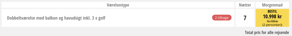 ![]() Bemærk: Bravo Tours viser den samlede pris for to personer. Rejs365 er ikke et rejsebureau, men en rejseside, der finder gode tilbud! – Vi modtager kommission, men det påvirker ikke din pris! Læs mere her |
