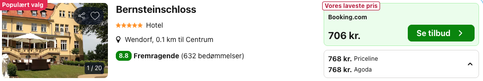 ![]() Bemærk: Den samlede pris for 2 personer i et dobbeltværelse er 706,- hvilket svarer til 353,- per person. Der kan være mindre prisforskelle på mobil og pc. Undersøg med fordel, hvor det er billigst inden bestilling. Rejs365 er ikke et rejsebureau, men en rejseside, der finder gode tilbud! – Vi modtager kommission, men det påvirker ikke din pris! Læs mere her