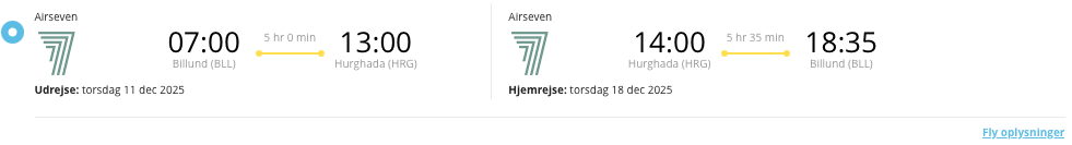 Hvis rejsen er med “Vis fly” og “Vis hotel” link, så er der tale om en sammensat rejse. Det vil sige at fly og hotel skal bestilles hver for sig. Prisen vi angiver vil dog være samlet for fly og hotel med mindre andet er angivet.