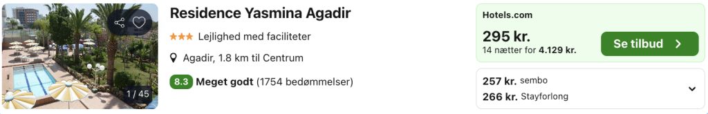 Hvis rejsen er med “Vis fly” og “Vis hotel” link, så er der tale om en sammensat rejse. Det vil sige at fly og hotel skal bestilles hver for sig. Prisen vi angiver vil dog være samlet for fly og hotel med mindre andet er angivet.