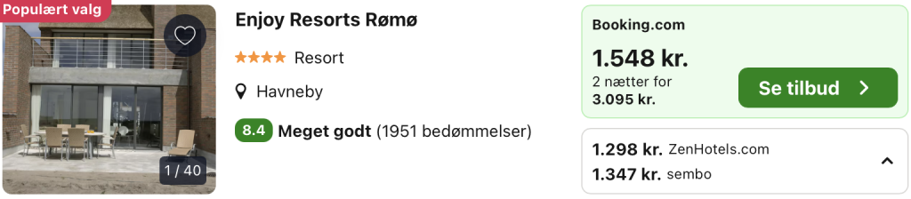 ![]() Bemærk: Den samlede pris for opholdet er 2.601,- for 2 personer i et dobbeltværelse, hvilket svarer til 1.301,- per person. Der kan være mindre prisforskelle på mobil og pc. Undersøg med fordel, hvor det er billigst inden bestilling Rejs365 er ikke et rejsebureau, men en rejseside, der finder gode tilbud! – Vi modtager kommission, men det påvirker ikke din pris! Læs mere her |