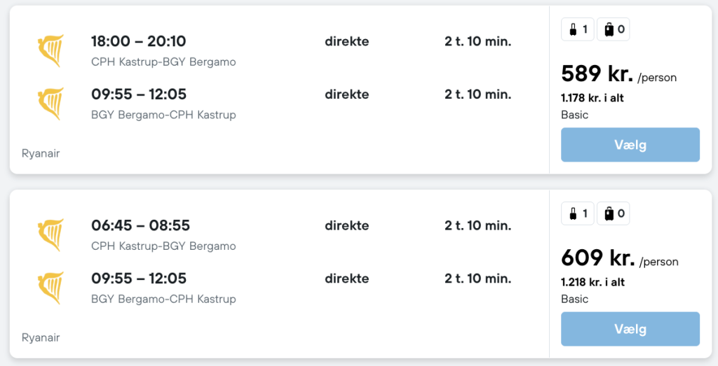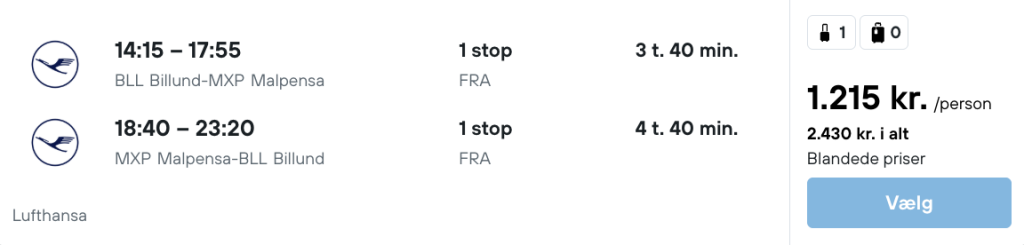 Billeje er super billigt i Milano og kan bestilles her. Husk at tilpasse flytider og lufthavne, så de passer med dine fly.