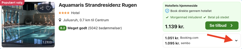 Vi har taget udgangspunkt i et weekendophold fra 8. – 9. november. Der er andre datoer til gode priser på Aquamaris Strandresidenz Rügen. Se et udvalg her.