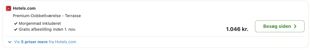 ![]() Bemærk: Den samlede pris for opholdet er 1.046,- for 2 personer i et dobbeltværelse hvilket svarer til 523,- per person.Rejs365 er ikke et rejsebureau, men en rejseside, der finder gode tilbud! – Vi modtager kommission, men det påvirker ikke din pris! Læs mere her |