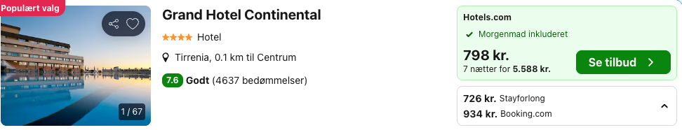 Hvis rejsen er med “Vis fly” og “Vis hotel” link, så er der tale om en sammensat rejse. Det vil sige at fly og hotel skal bestilles hver for sig. Prisen vi angiver vil dog være samlet for fly og hotel med mindre andet er angivet.