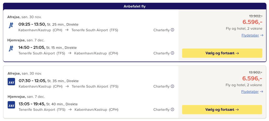 Hvis rejsen er med “Vis rejse” link, så er der tale om en pakkerejse, hvor fly og hotel bestilles på en gang.