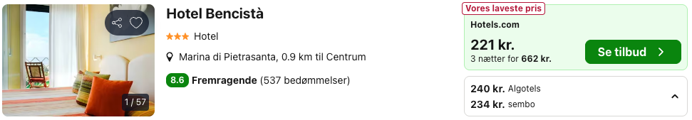 Hvis rejsen er med “Vis fly” og “Vis hotel” link, så er der tale om en sammensat rejse. Det vil sige at fly og hotel skal bestilles hver for sig. Prisen vi angiver vil dog være samlet for fly og hotel med mindre andet er angivet.