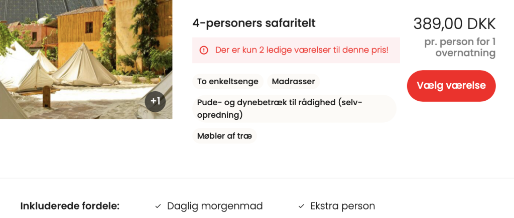 Bemærk: Vi har taget udgangspunkt i 2 voksne og 2 børn i et safari telt, men man kan sagtens være et andet antal personer eller vælge en anden type indkvartering.