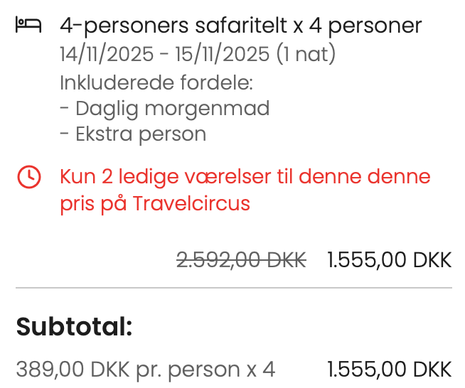 Bemærk: Den samlede pris for overnatningen er 1.555,- for 4 personer i et telt, hvilket er 389,- per person. |