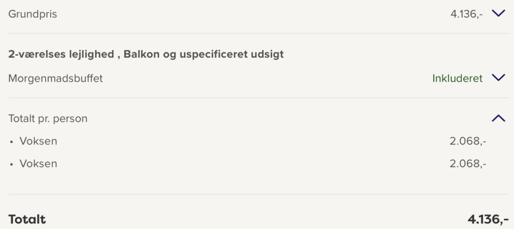 Prisen tager udgangspunkt i 2 personer. Man kan oftest rejse flere voksne og eller med børn og derved typisk opnå en billigere pris pr. person.