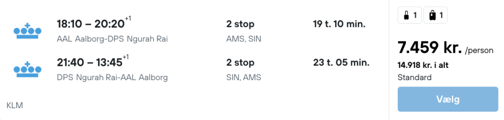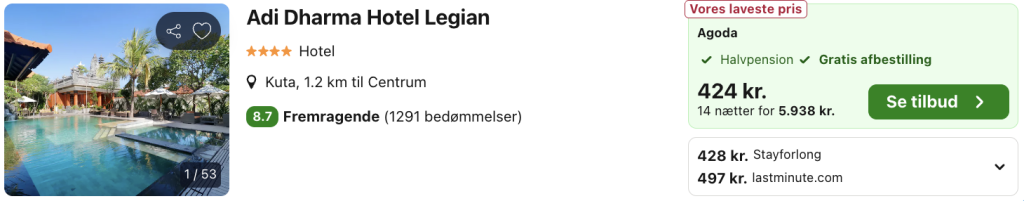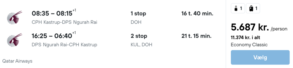 Flyet afgår fra Danmark den 26. november, mens ankomst på Bali er den 27. november. Dette er der taget højde for i hotelovernatning. Rejs365 er ikke et rejsebureau, men en rejseside, der finder gode tilbud! – Vi modtager kommission, men det påvirker ikke din pris! Læs mere her |